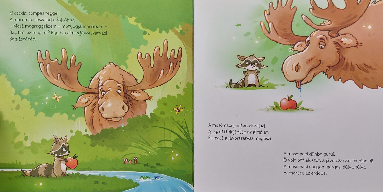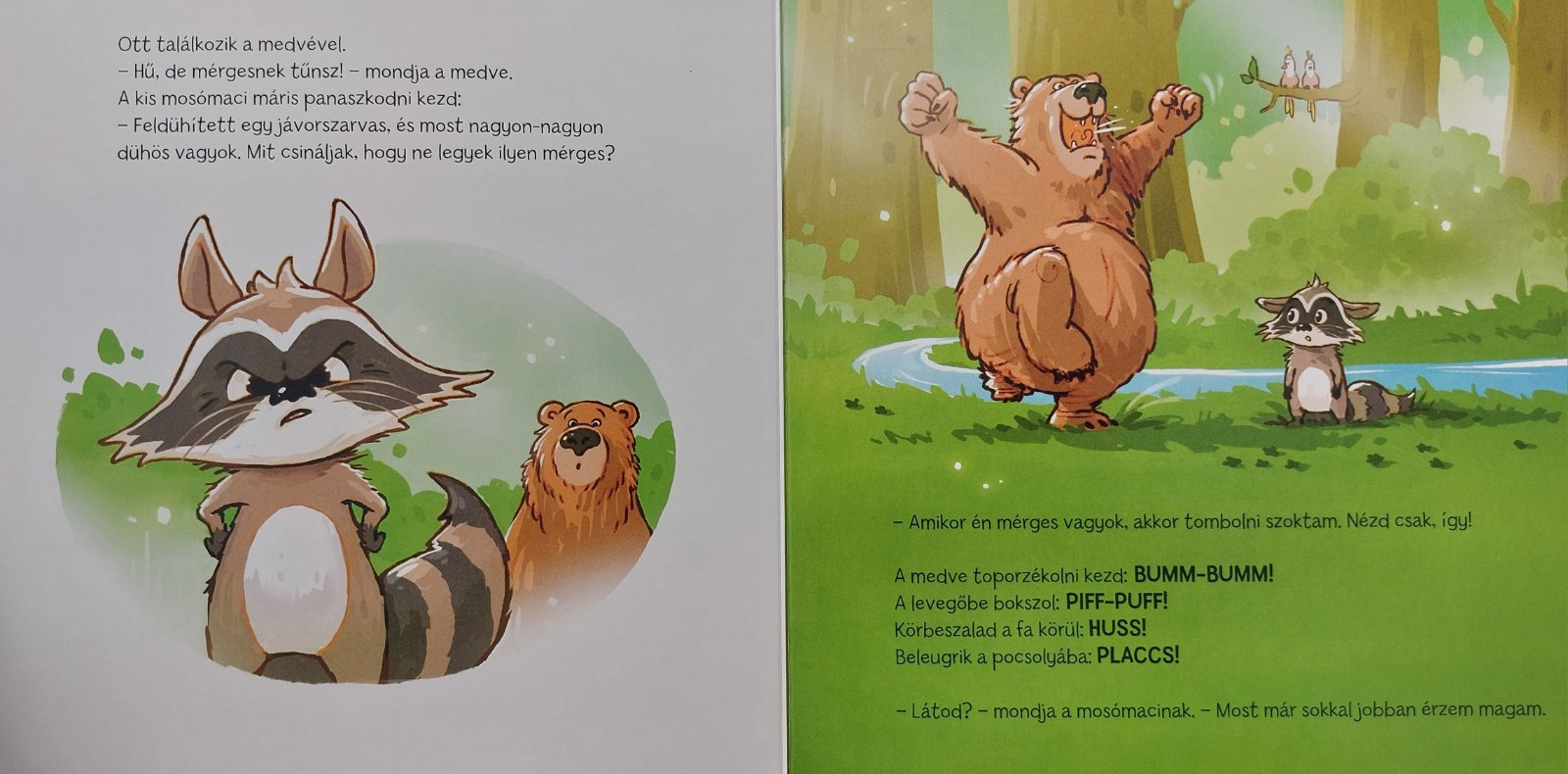 Mérgesen trappol a mosómaci az erdőn át. Egy jávorszarvas elvette az almáját! A mosómaci megkérdez minden útjába kerülő állatot, hogy mit tesznek, amikor dühbe gurulnak. Egymástól teljesen eltérő válaszokat kap. A bagoly mélyeket lélegzik, a puma ordít, a mókus torkaszakadtából bömböl. Vajon mi segít a mosómacinak, hogy elszálljon a mérge?
