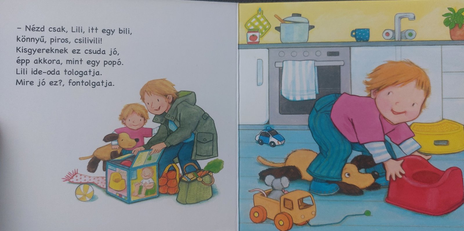 Lili kap egy szép piros bilit. Minden kis játék állata ráülhet és kipróbálhatja: a mackó, a kisegér és a kacsa is. Na de végül kinek sikerül belepisilnie? Egyedül csak Lilinek! Éljen, éljen! Nem kell többé pelenka! Ugye, milyen csuda könnyű bilibe pisilni?