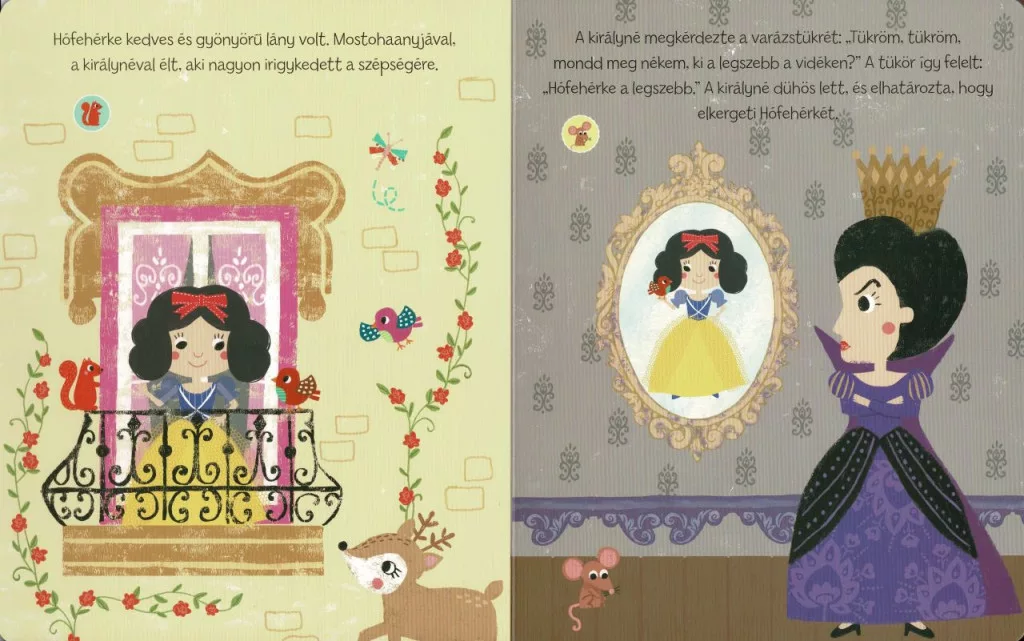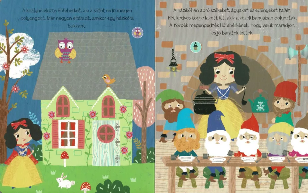 A Mesés hangoskönyvek – Hófehérke és a hét törpe egy varázslatos, interaktív hangoskönyv, amely a klasszikus mese világába vezeti be a legkisebbeket. A jól ismert történet – Hófehérke menekülése a gonosz mostoha elől, az erdei bolyongás, a hét törpe kedves otthona és a bűvös alma cselszövése – ebben a könyvben különleges formában kel életre: a gyerekek nemcsak nézhetik a színes, kedves illusztrációkat, hanem meg is hallgathatják a mese egyes részleteit, így a történet igazán élményszerűvé válik.